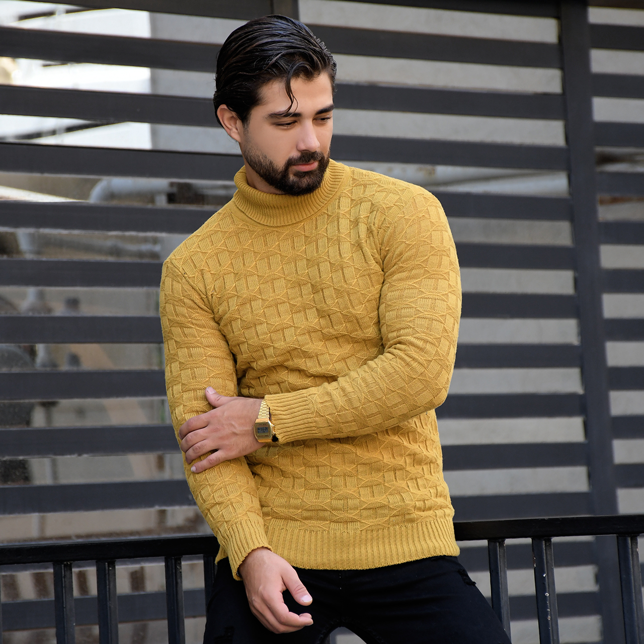 پلیور یقه اسکی خردلی طرح لوزی مردانه مدلG10